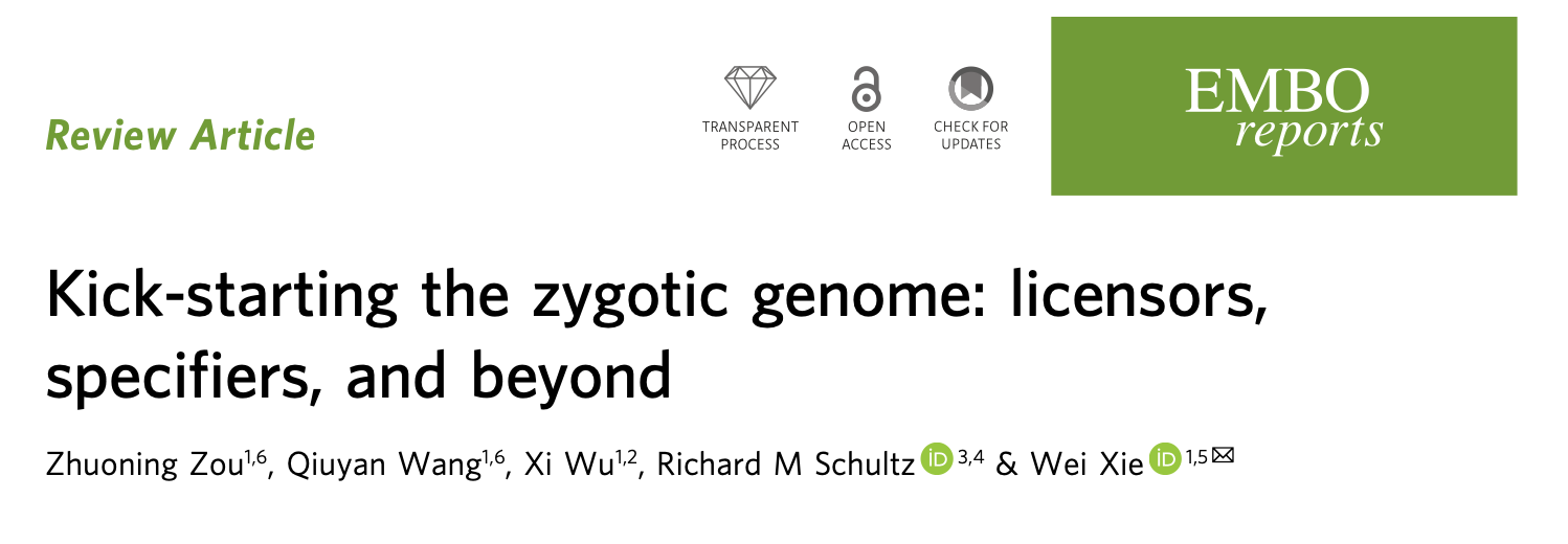 2024年8月19日,清华大学生命科学学院颉伟团队在《欧洲分子生物学学会报告》(embo reports)杂志发表题目为 “启动合子基因组:许可因子,特异因子及其他调控因子” (kick-starting the zygotic genome: licensors, specifiers, and beyond) 的特邀综述文章。该综述将调控zga的因子总结为了两类:一类为zga许可因子(licensors),它们参与控制zga事件是否能被允许发生以及何时发生 ;另一类是特异性决定因子(specifiers),它们在zga过程决定了哪些基因被特异性激活。该综述基于多个物种zga调控机制的相关研究,总结了zga许可因子和zga特异因子以及它们的工作机制,并讨论了表观遗传重编程对于zga的作用,为深入理解zga激活机制提供了新的见解。