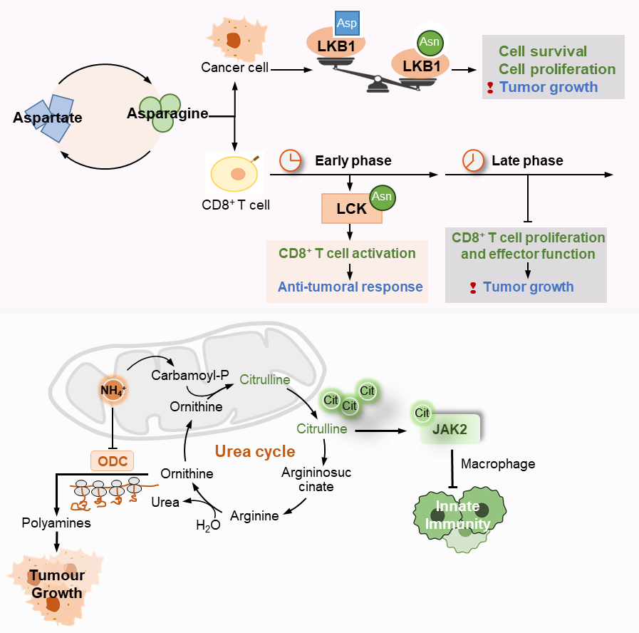 图1. 肿瘤细胞通过改变天冬酰胺和尿素循环等代谢途径促进增殖和影响微环境免疫细胞功能