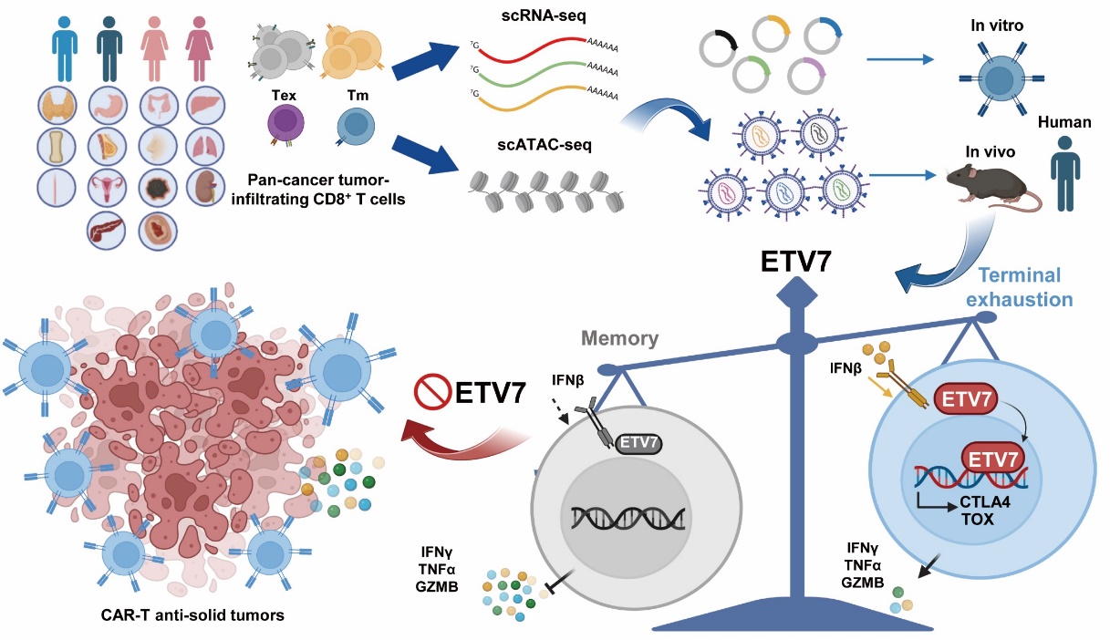 图1. 肿瘤病人单细胞多组学与筛选鉴定到etv7作为调控cd8 t细胞命运的转录焦点,促进cd8 t细胞的终末分化(耗竭)与功能缺失。靶向etv7有效增强car-t杀伤实体瘤的效率。